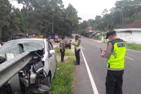 Sebuah mobil Toyota Agya mengalami kecelakaan hingga menabrak besi pembatas jalan di Jalan utama Ban...