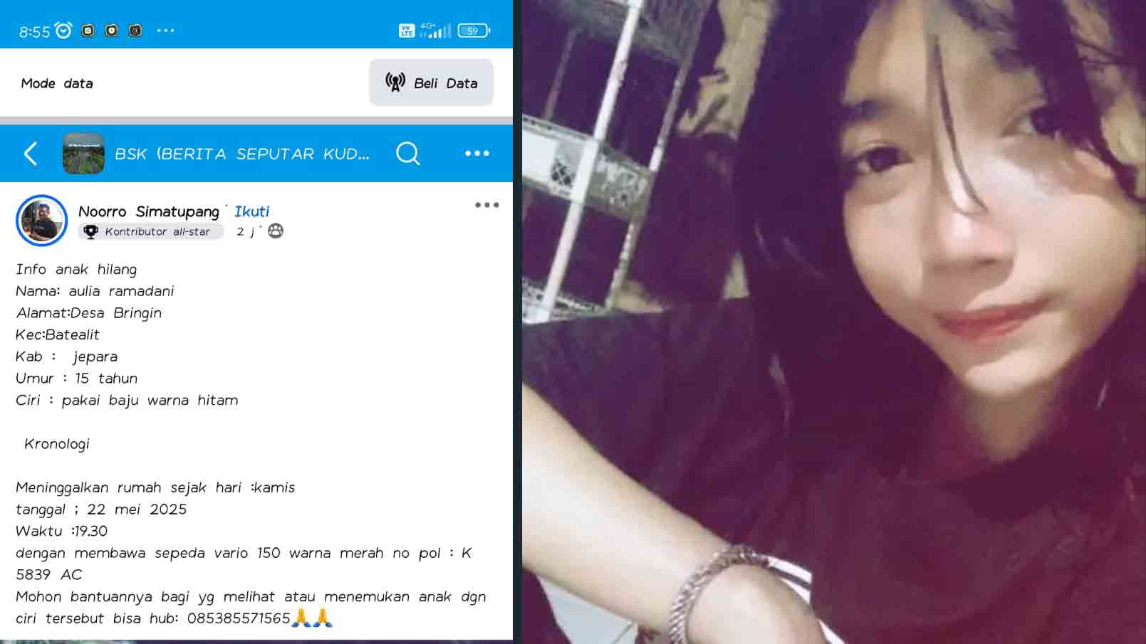 Seorang bocah perempuan berusia 15 tahun asal Desa Bringin, Kecamatan Batealit, Kabupaten Jepara, Jawa Tengah (Jateng) dilaporkan hilang. Diduga, bocah bernama Aulia Ramadani itu pergi bersama anak jalanan.
