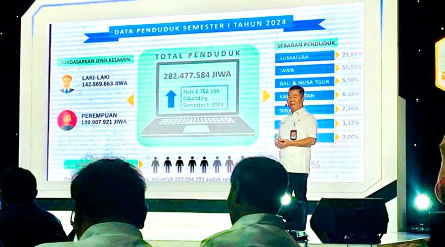 Direktorat Jenderal Kependudukan dan Pencatatan Sipil (Dukcapil) Kementerian Dalam Negeri mencatat jumlah penduduk Indonesia mencapai 282.477.584 jiwa pada semester I tahun 2024. Angka ini menunjukkan kenaikan sebanyak 1.752.156 jiwa dibandingkan sem