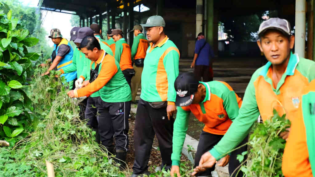 Lahan eks Stasiun Kudus mulai dibersihkan, Jumat (8/8/2025). Tampak Bupati Kudus, Samani Intakoris bersama jajaran hingga petugas kebersihan DPKPLH Kudus bekerja bakti membersihkan tempat itu.