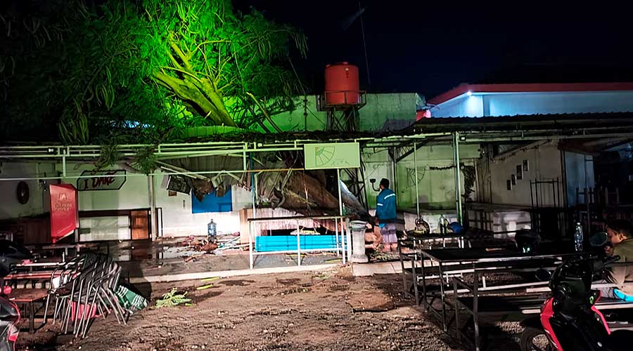 Sebatang pohon flamboyan berukuran besar tumbang menimpa sebuah kedai kopi dan Plaza Telkom Pati, Selasa (5/3/2024) malam. Pohon itu berada di pinggir Jalan P Sudirman, tepatnya di depan Gedung Juang Pati.