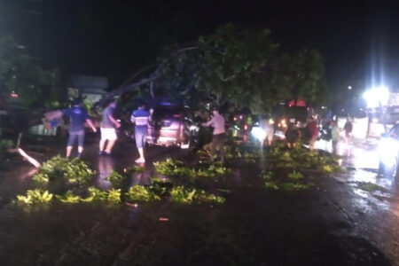 Sebuah pohon tumbang dan menimpa mobil Pejero Sport di Jalan Pati-Tayu. Tepatnya di depan Pasar Tran...