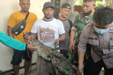 Seekor buaya muara sepanjang 2,5 meter yang kerap muncul di Kali Pucang, di Kelurahan Kuripan Kertoh...