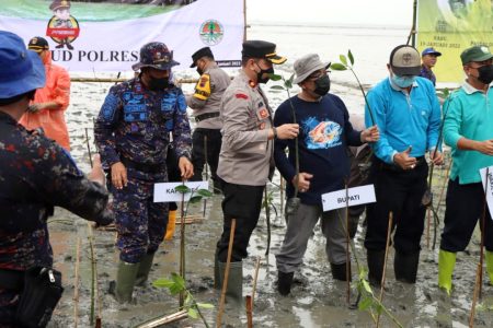 Satuan Polairud Polres Jepara bersama TNI dan masyarakat melaksanakan kegiatan bakti sosial ’Mageri Segoro’. Aksi dilakukan dengan penanaman ratusan bibit pohon mangrove dan bersih-bersih pantai di pesisir pantai Prawehan Bandengan