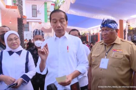 Presiden Joko Widodo (Jokowi) menyerahkan Bantuan Subsidi Upah (BSU) ke para pekerja di Kabupaten Ba...