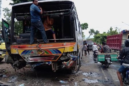 Kecelakaan maut antara Bus Rela dengan dua mobil dan satu motor terjadi di Sumberlawang Sragen. Di l...
