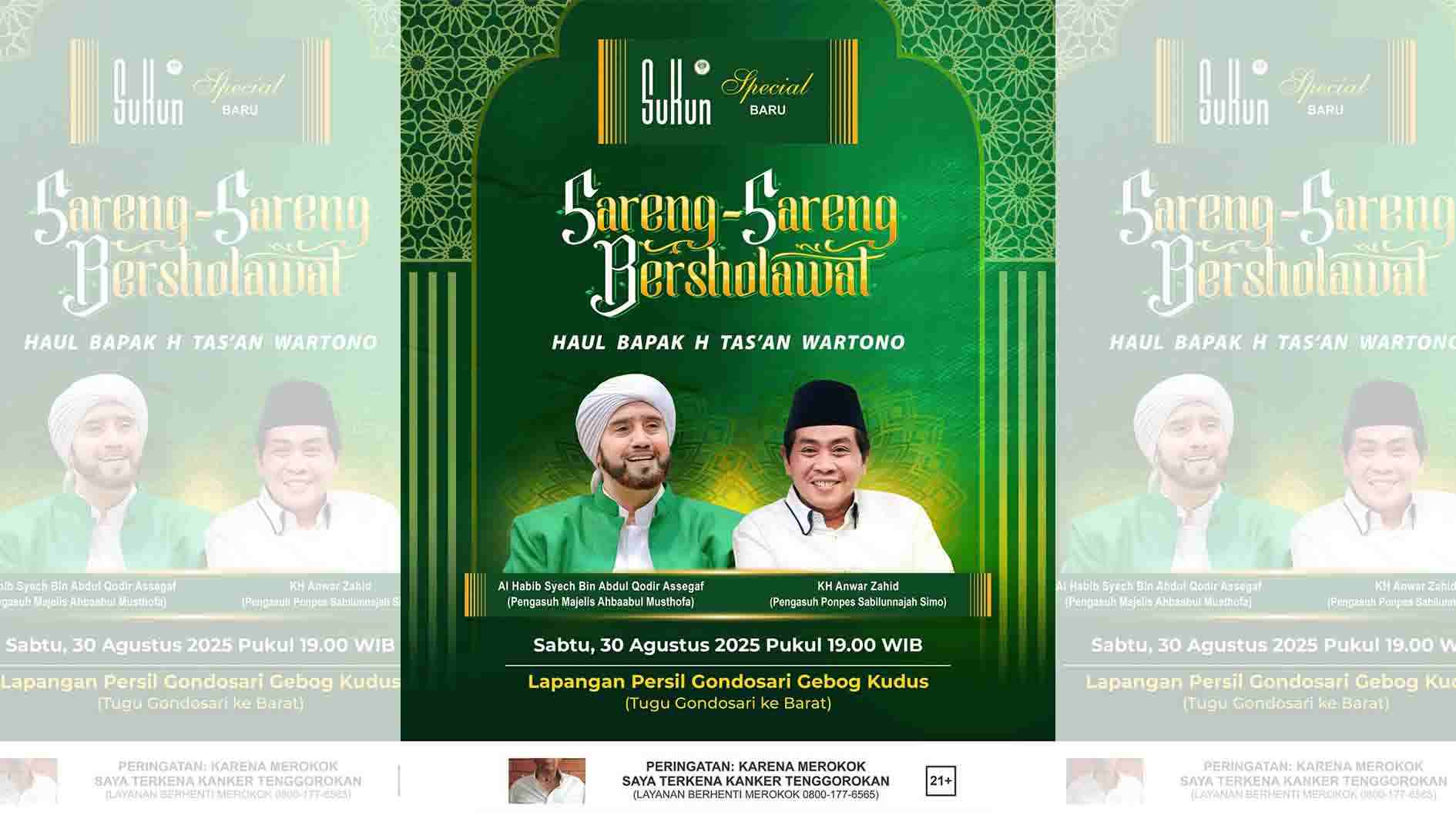 Acara Sareng Sareng Bersholawat bakal digelar di lapangan Persil, Desa Gondosari, Kecamatan Gebog, Kabupaten Kudus, Jawa Tengah, pada Sabtu (30/8/2025) malam.